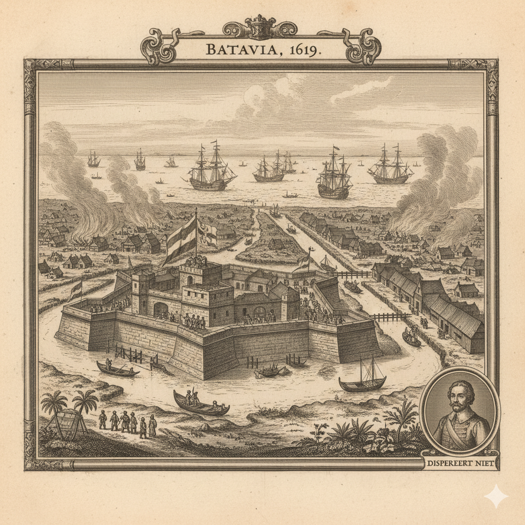 Setelah membumihanguskan Jayakarta, pelabuhan kecil Kesultanan Banten, Coen menegakkan benteng pertamanya. Ia menamai kota baru itu Batavia, sebuah bentuk propaganda kolonial untuk menanamkan identitas Eropa. Di balik nama megah itu, tersembunyi ironi besar: kota ini dibangun sebagai lambang kemajuan, tetapi di atas reruntuhan, darah, dan lumpur.