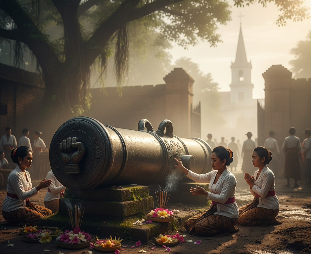 Tepat di gerbang kota tua, di antara lumpur dan sisa tembok, berdiri meriam perunggu besar bernama Si Jagur. Setengah tertimbun tanah, benda ini menjadi titik pertemuan mitologi lokal dan simbol kekuasaan kolonial.