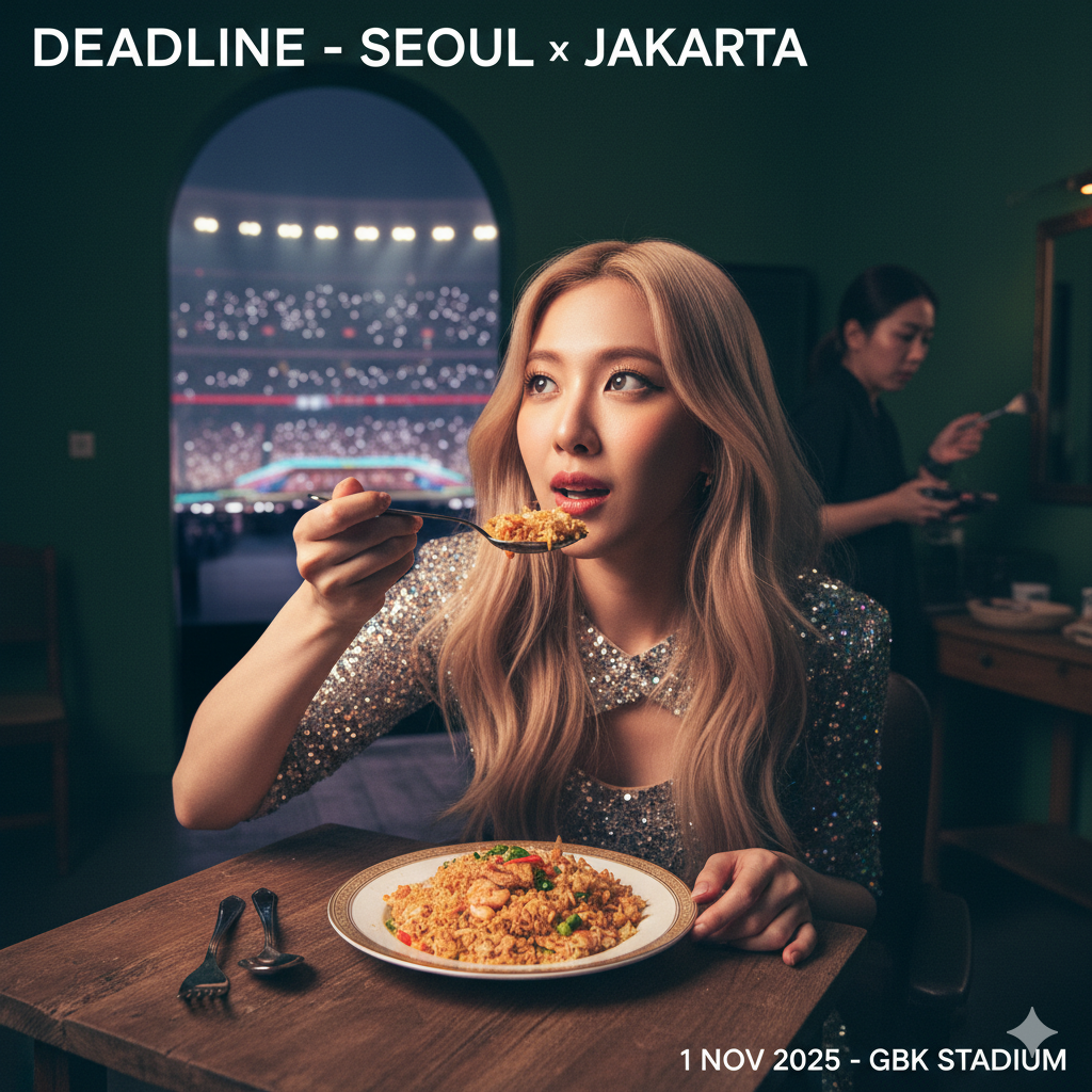 Rose BLACKPINK mengejutkan penggemar dengan momen makan nasi goreng sebelum tampil solo di konser ‘DEADLINE’ GBK, Sabtu (1/11/2025).